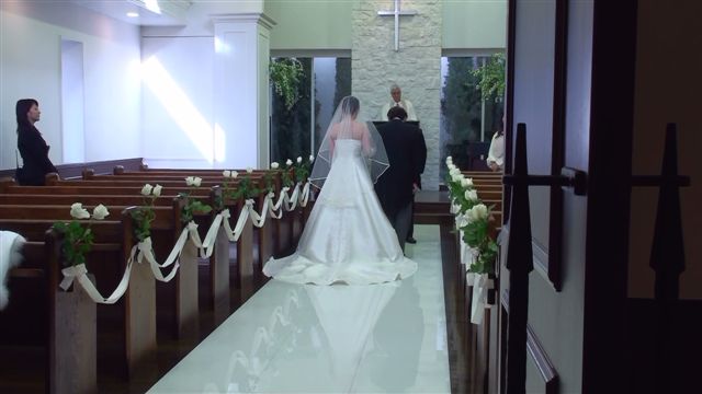 で、いよいよ入場ですが、その前にオープニングムービーを流してもらうことになっていました。わたしたちのこれまでを写真で振り返ったもの。古い写真はスキャナで読み込んで一生懸命作りました。BGMはふたりとも大好きな曲、No daubt のRunningです。