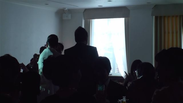 まずは新郎の入場。なぜかさざなみのように起こる笑い